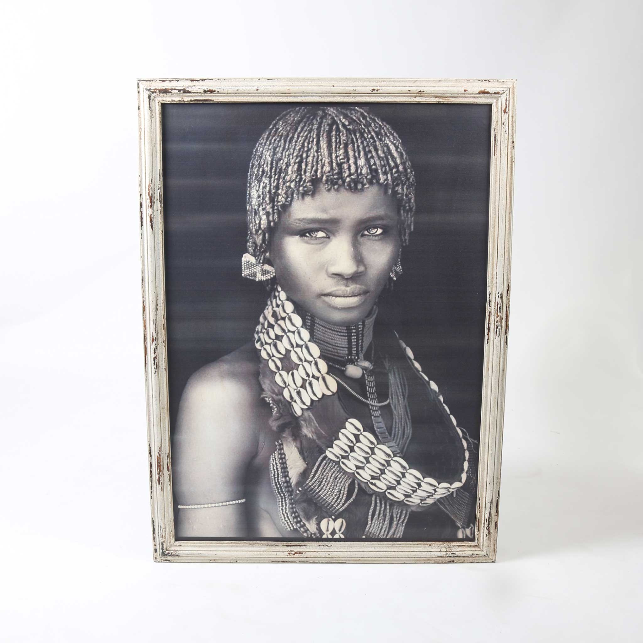 A captivating print on coarse canvas finished with a rustic wood frame.